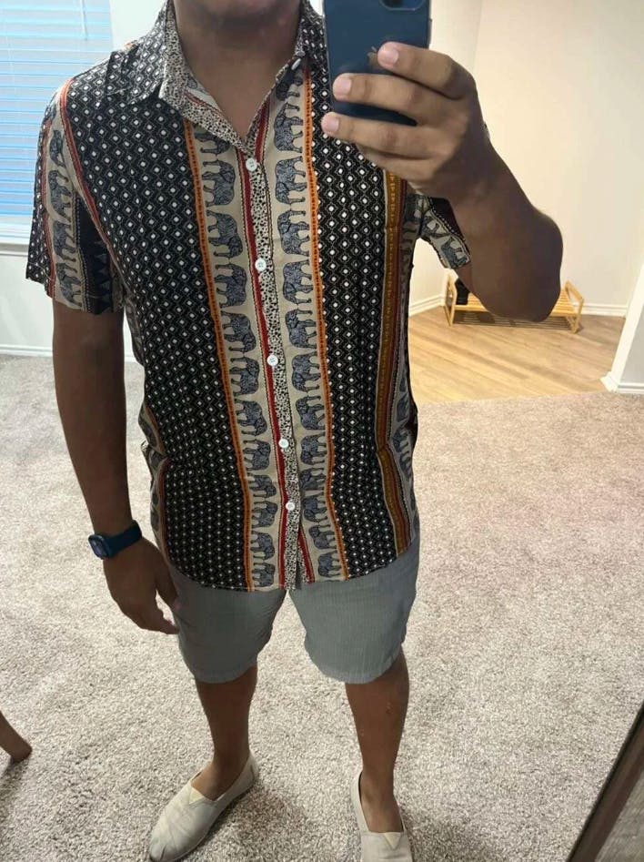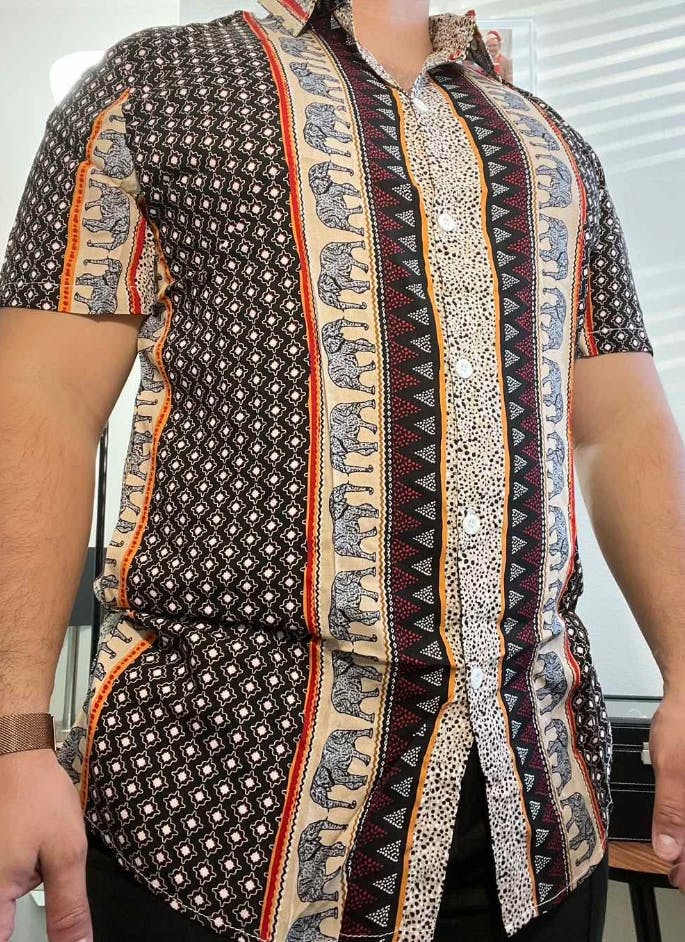Camisa masculina vintage estilo étnico tribal com estampa de elefantes manga curta